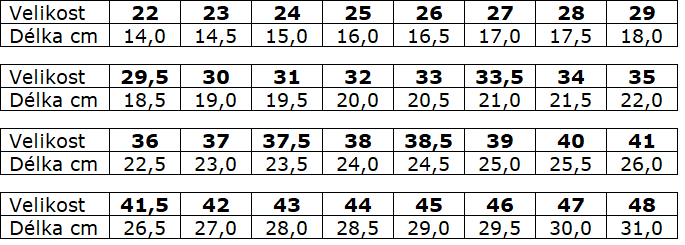 Tabulka velikostí: